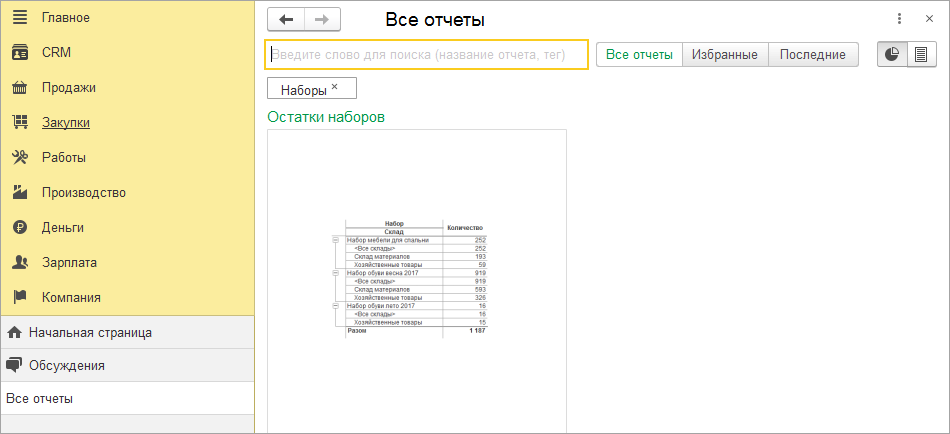 Отчет доступен в разделе Закупки, также его можно быстро найти по тегу Наборы.