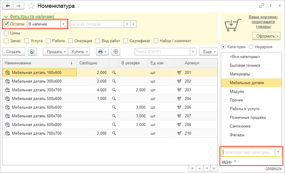 При использовании такого отбора пользователь увидит все товары или услуги, имеющие выбранную характеристику. Например, все товары категории "Мебельные детали" из материала "МДФ".