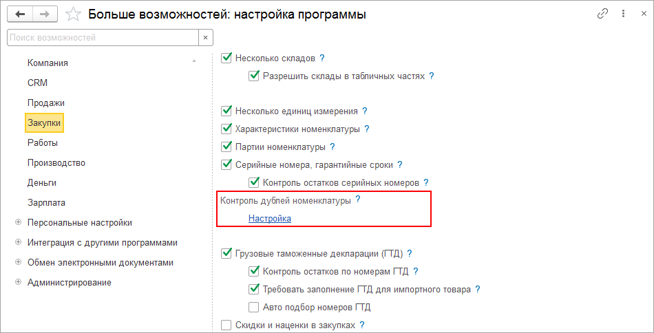 Для использования новой возможности необходимо предварительно настроить набор реквизитов для проверки. Сделать это можно в разделе Закупки – Еще больше возможностей по гиперссылке Настроить.