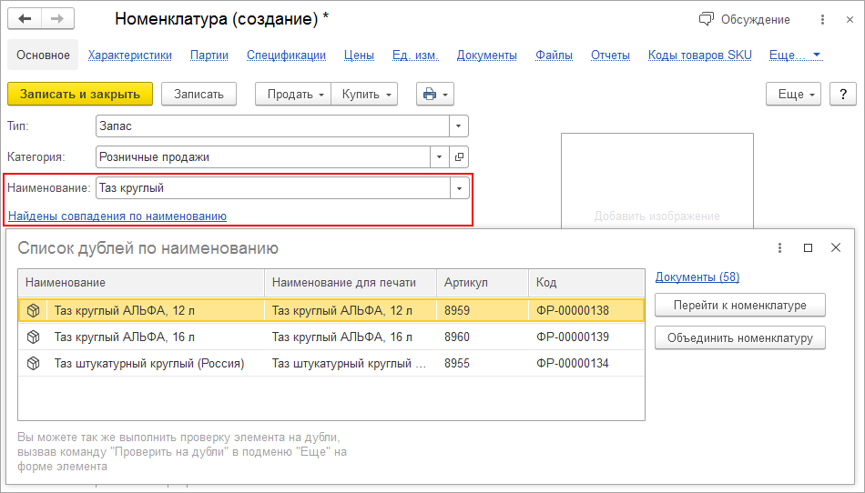 Если в базе уже есть аналогичная карточка номенклатуры, программа сообщит, что найдены совпадения. Подсказка появится в любой карточке номенклатуры, у которой в базе есть "двойник".