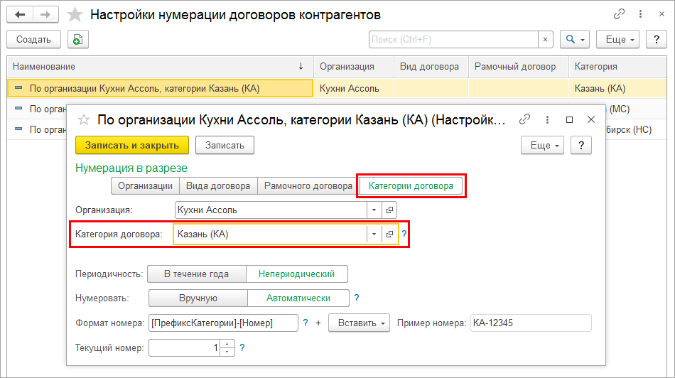 Настройка позволит выполнять сквозную нумерацию в внутри произвольных группировок (категорий) и быстро находить договора определенного вида, например при параллельной работе нескольких отделов с одним клиентом.