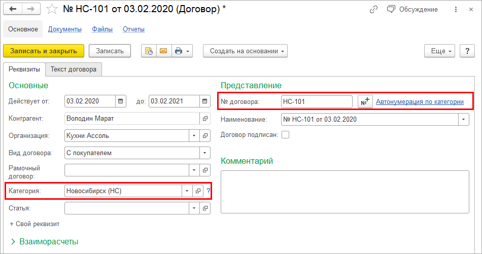 В карточке договора указывается категория, в зависимости от которой ему будет автоматически присвоен номер.