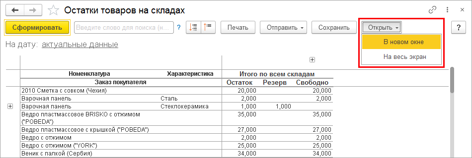 Важно отметить, что отбор доступен только при установленном фильтре Остатки – В наличии.