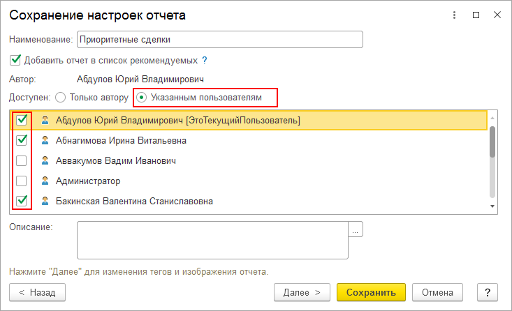Выберите пользователей, которым хотите предоставить доступ к своему варианту отчета. Сохраните отчет.