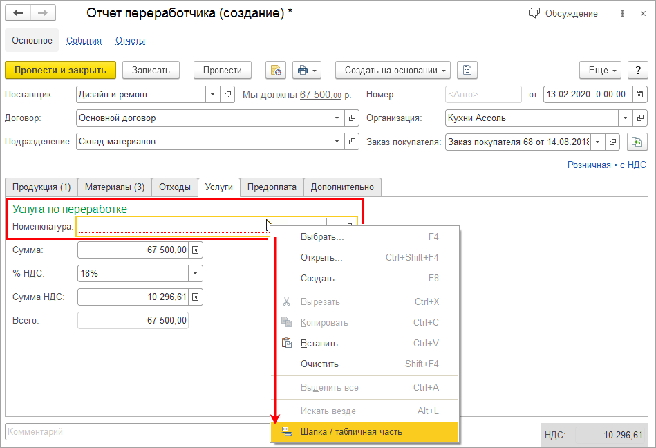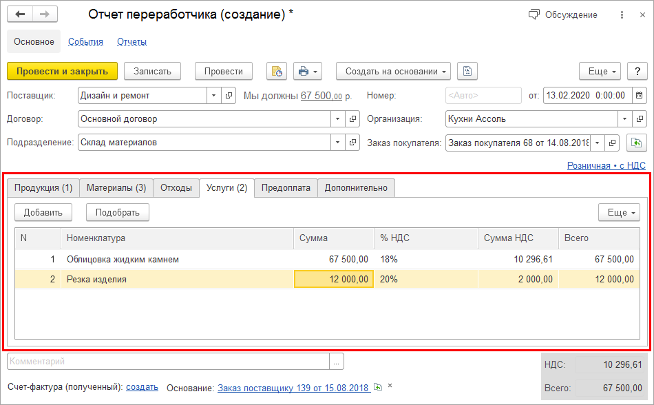 Все расходы по переработке теперь можно легко учесть в одном документе. В документе "Отчет переработчика" появилась возможность ввести несколько услуг (списком).