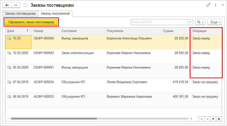 Заказ-наряды, для выполнения которых необходимо докупить позиции у поставщика, отображаются в списке документов Заказы поставщикам на вкладке Заказы покупателей.