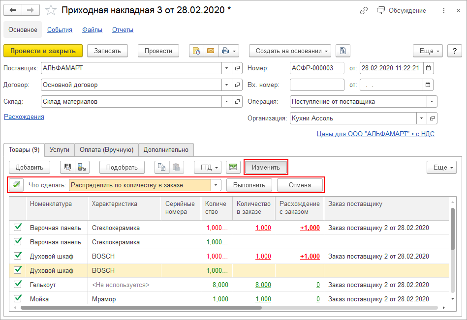 Добавлена команда, позволяющая в один клик распределить накладную в соответствии с заказом поставщику. Для "лишних" товаров в документ добавляется новая строка без уточнения заказа, а в исходной строке количество уменьшается на количество излишка.