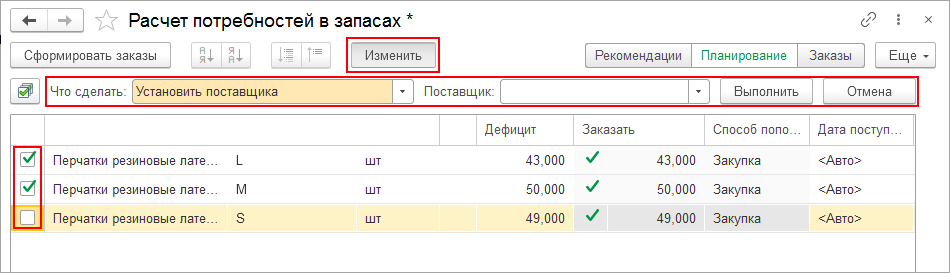 При расчете потребностей в товарах и материалах появилась возможность быстро изменить поставщика или изготовителя сразу для нескольких товаров. В окно расчета добавлен стандартных механизм группового заполнения.