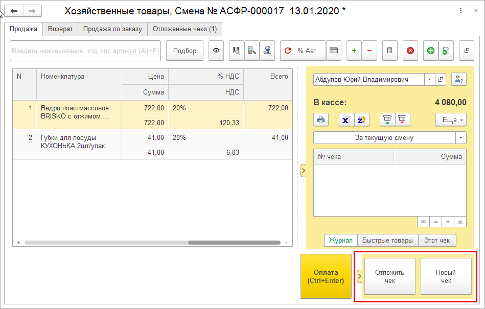 Чтобы сохранить чек кассиру достаточно нажать на кнопку Отложить чек. Отложить можно любой чек если по нему еще не произведена оплата.