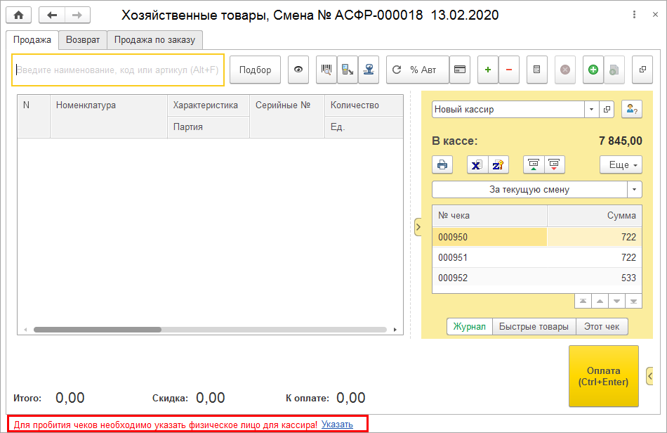 Теперь, при открытии рабочего места кассира (РМК) и документа Чек ККМ программа сразу проверит информацию о пользователе и сообщит о необходимости ее заполнить для использования кассового оборудования.