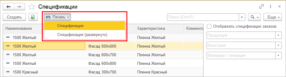 Быстро распечатать спецификации можно из одноименного справочника.
