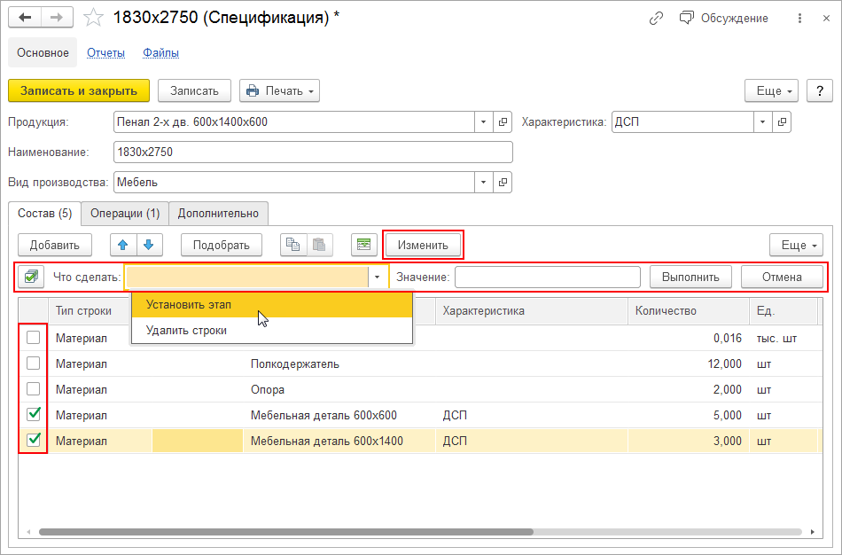 Для заполнения этапов откройте карточку спецификации (Производство – Спецификации) и нажмите на кнопку Изменить в таблице Состав.