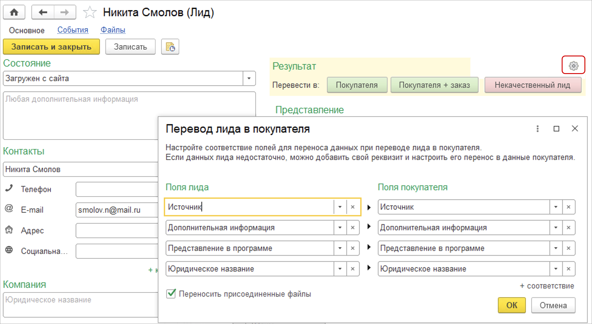 При переводе лида в покупателя все файлы потенциального клиента будут также перенесены, что позволит не потерять важные документы.