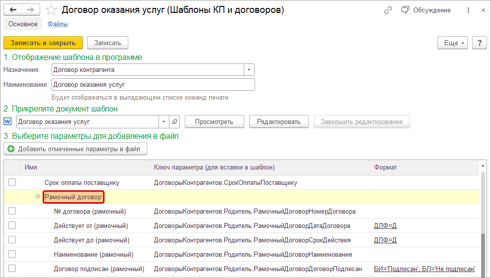 Теперь для договора контрагента можно добавить параметры рамочного договора.