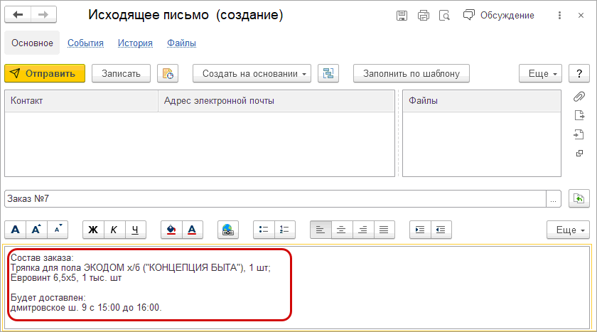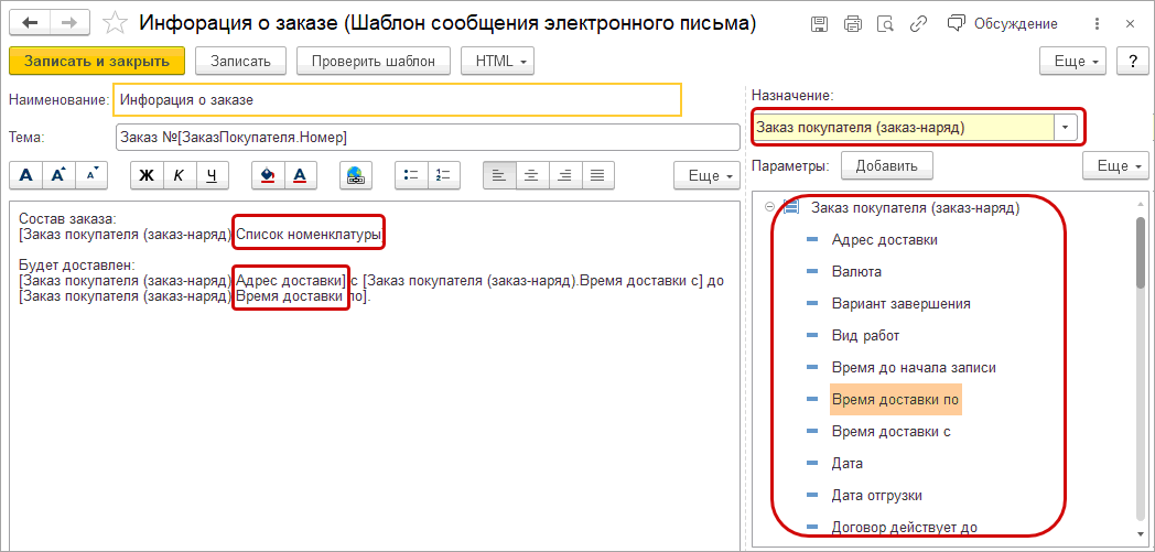 В шаблоне письма для документа "Заказ покупателя" получил развитие параметр "Список номенклатуры".