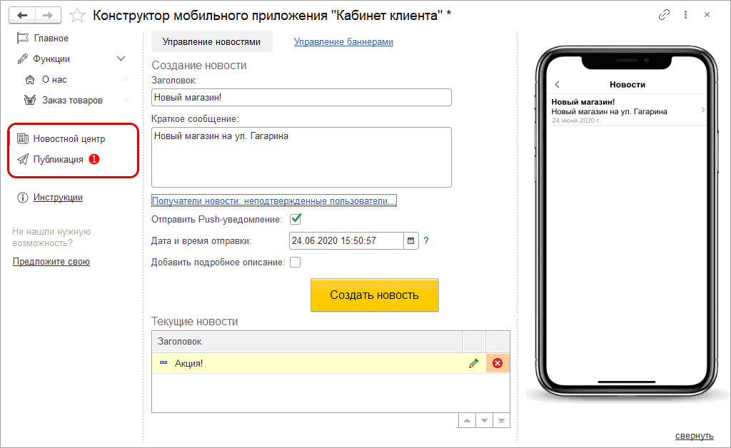 Теперь в конструкторе можно создавать новости и отправлять Push-уведомление
