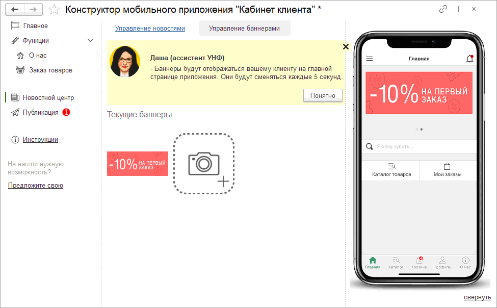 Воспользоваться новыми возможностями можно в разделе «Новостной центр» конструктора мобильного приложения «Кабинет клиента».