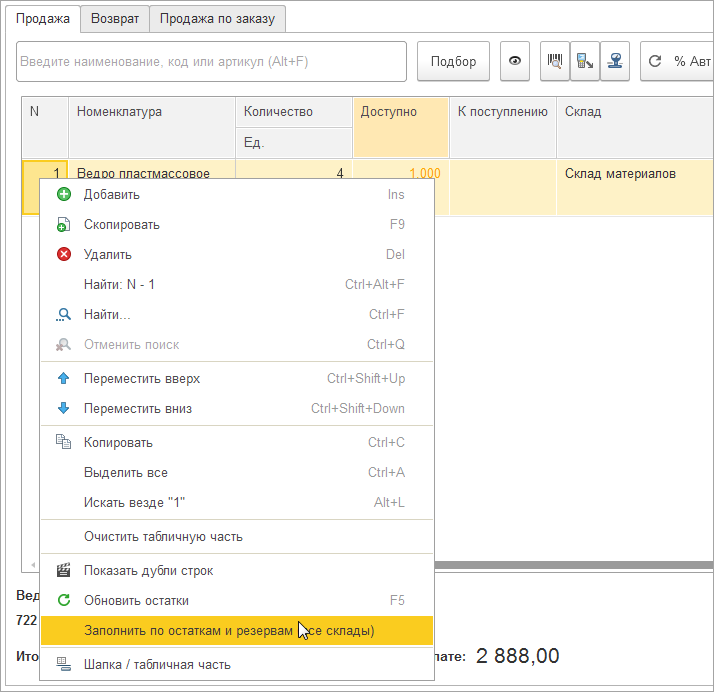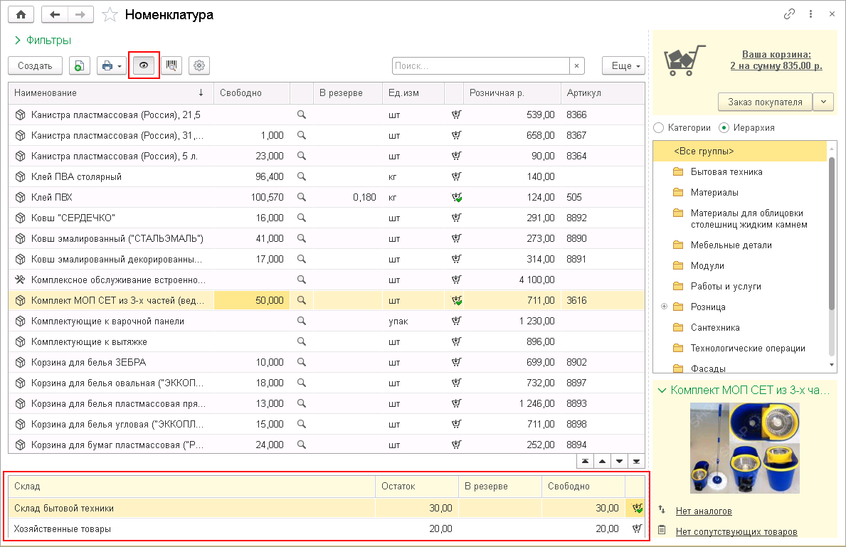 Для розничной торговли расширены возможности режима Остатки и резервы аналогично документам