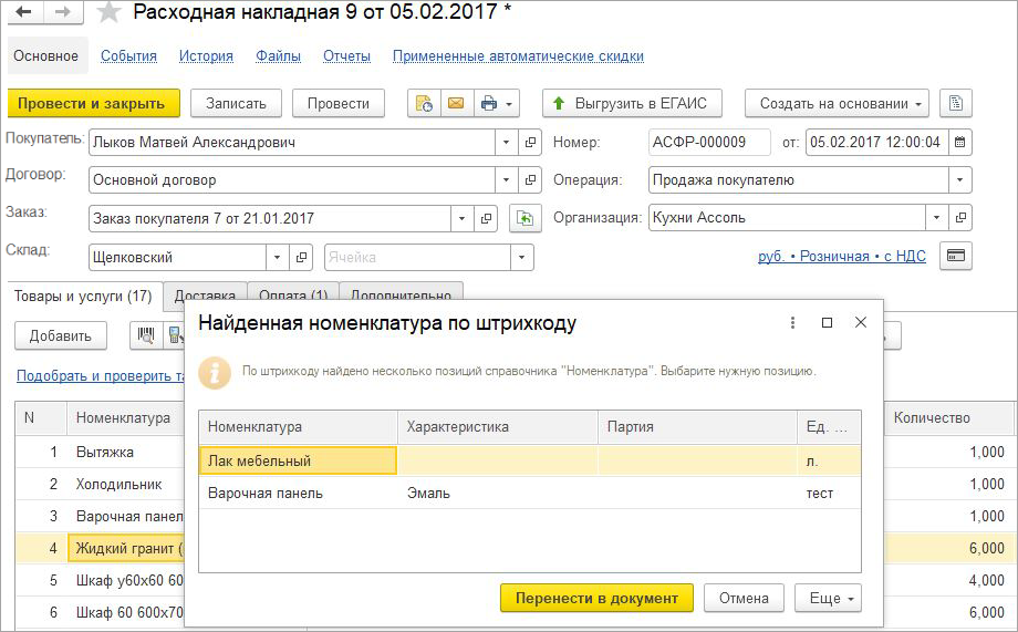 Если найдено несколько совпадений при поиске по штрихкоду, то будет предложено выбрать нужную позицию.