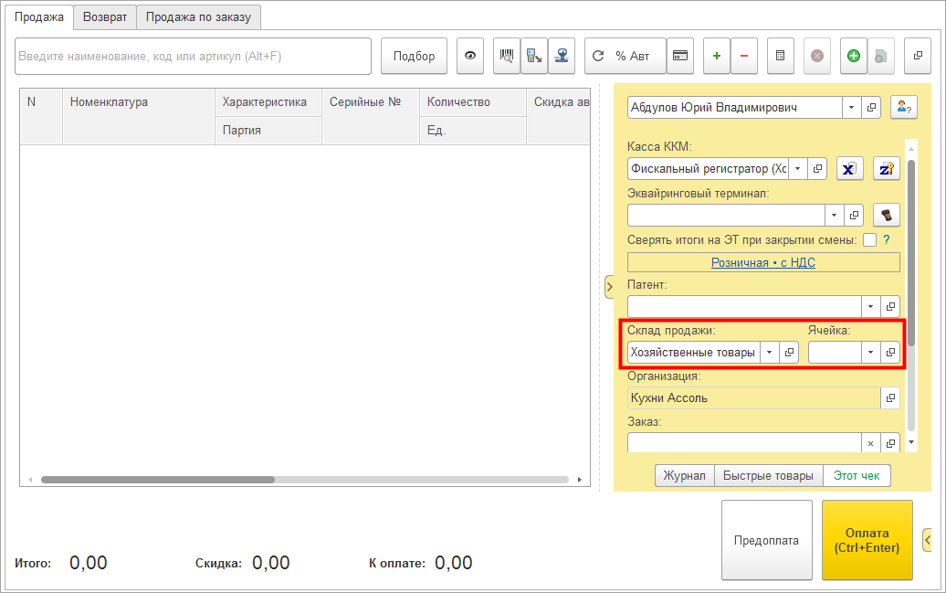 Для выбора доступны только склад, указанный в карточке кассы ККМ, и склады, перечисленные в настройках.