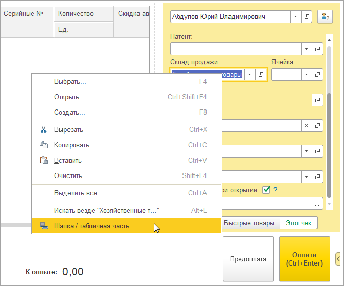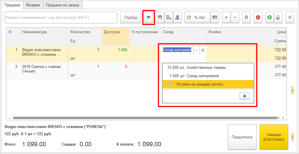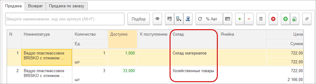 При размещении склада и ячейки в табличной части можно выполнить продажу одним чеком сразу с нескольких складов.