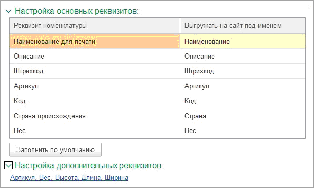В узле обмена с сайтом добавлена настройка, которая позволяет выбрать нужные дополнительные реквизиты и задать им имена для выгрузки.