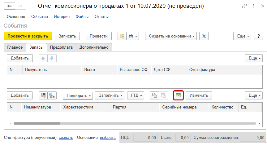 Для использования настроек откройте в разделе Продажи - Комиссионные продажи документ Отчет комиссионера на закладке Запасы.