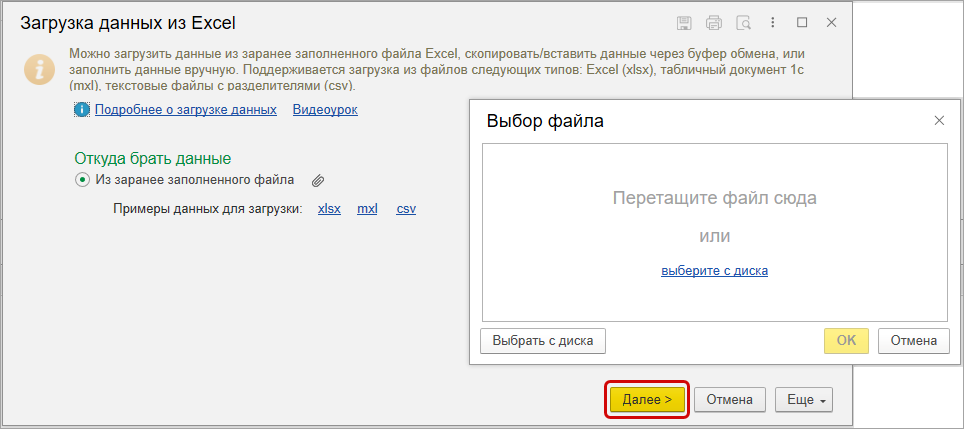 Появилась возможность загружать файлы Excel в табличные части документов: