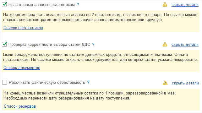 Получил развитие механизм предварительного анализа корректности учета и закрытия месяца.