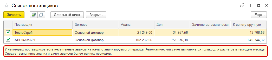 Если автоматически зачесть аванс не удается, доступен подробный анализ расчетов