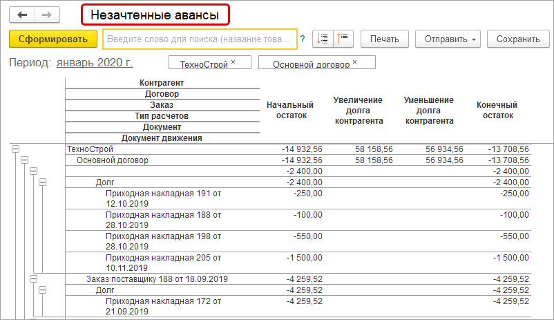 Выполняется проверка отсутствия на конец месяца остатков долга и аванса в пределах одного договора расчетов с контрагентом.