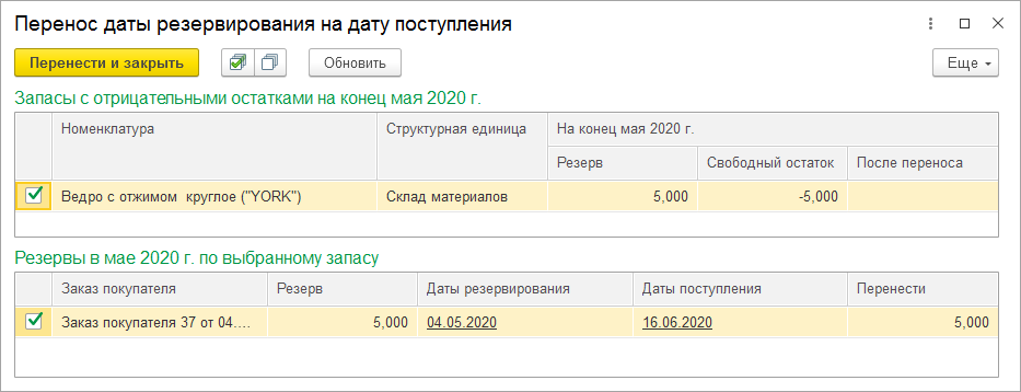 Если отрицательный остаток возник в результате предварительного резервирования поступившего позднее запаса, можно выполнить автоматический перенос момента резервирования на дату поступления.