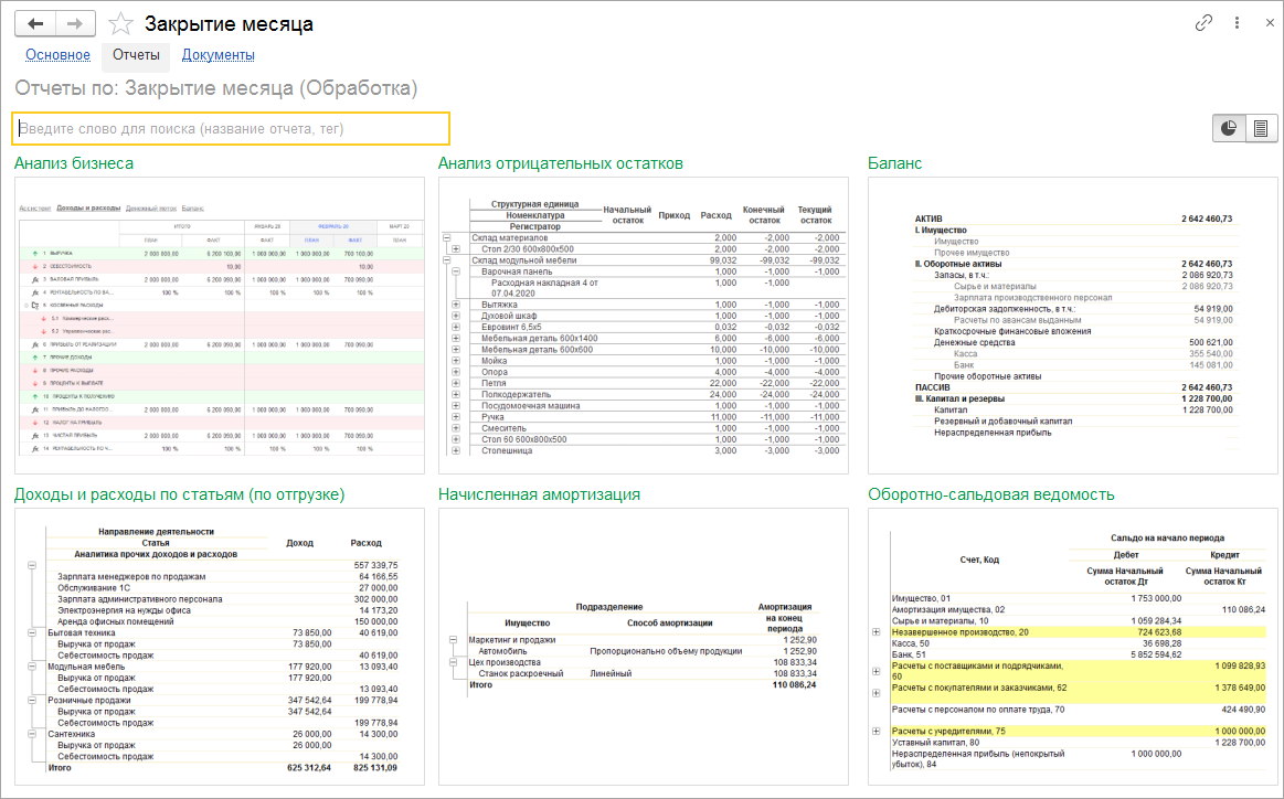 Анализ бизнеса, Баланс, Доходы и расходы, Оборотно-сальдовая ведомость, Начисленная амортизация, Прибыли и убытки, Финансовый результат.