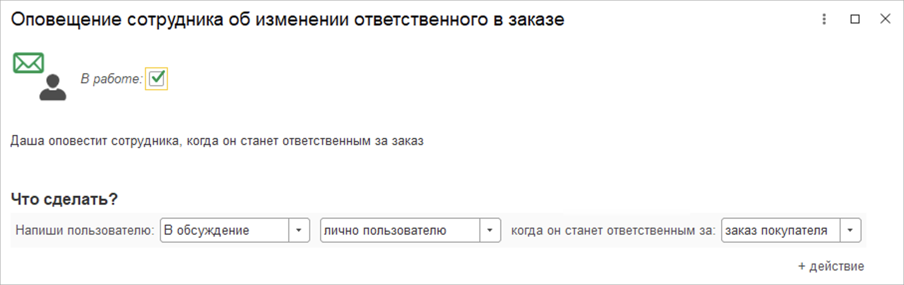 Во-вторых, Даша сообщит, когда сотрудник станет ответственным за заказ, чтобы не пропустить ни одного заказа.