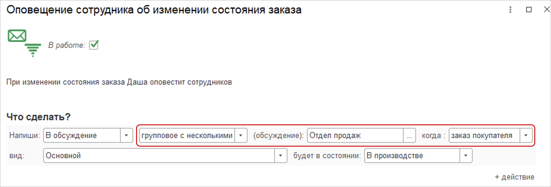 Ассистент управления нашей фирмы оповещает сотрудника о начале работы с заказом, если сотрудник работает с определенного состояния.