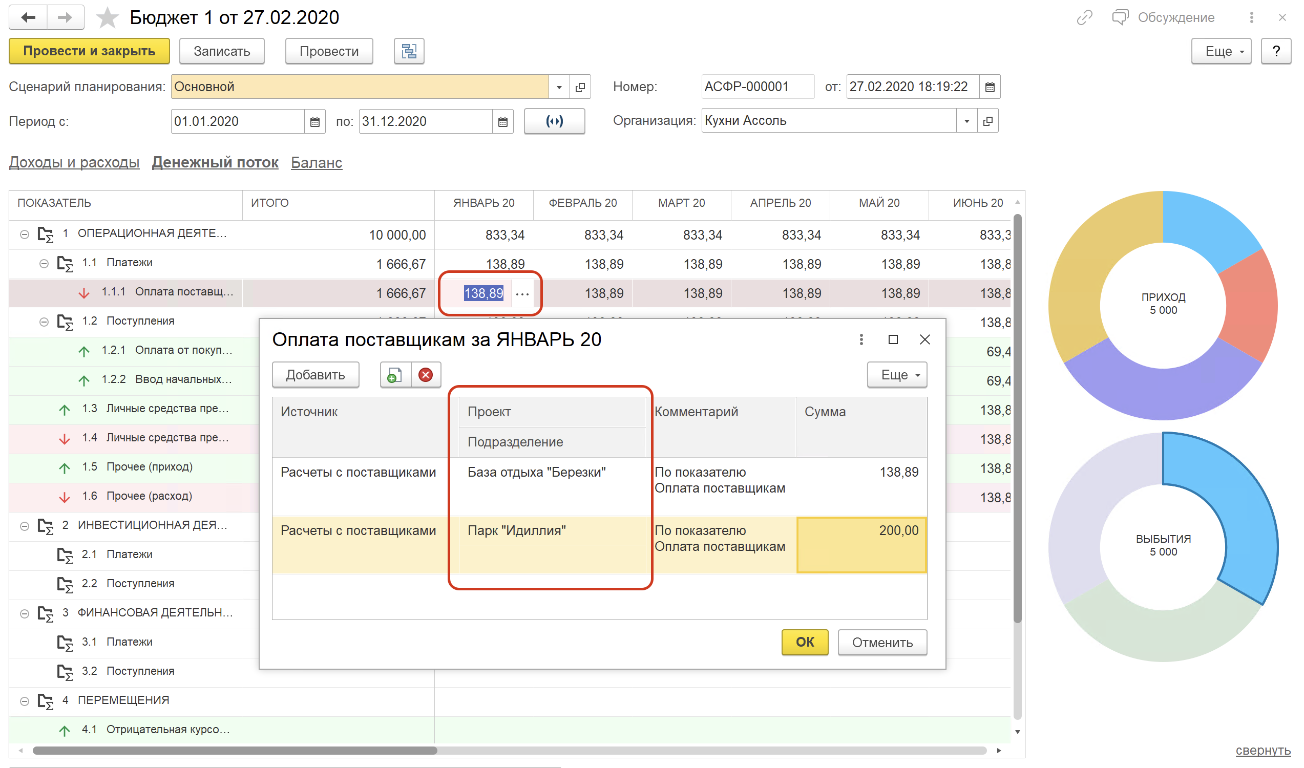 Детализация движения денежных средств по проектам и подразделениям доступна и при подготовке бюджетов.