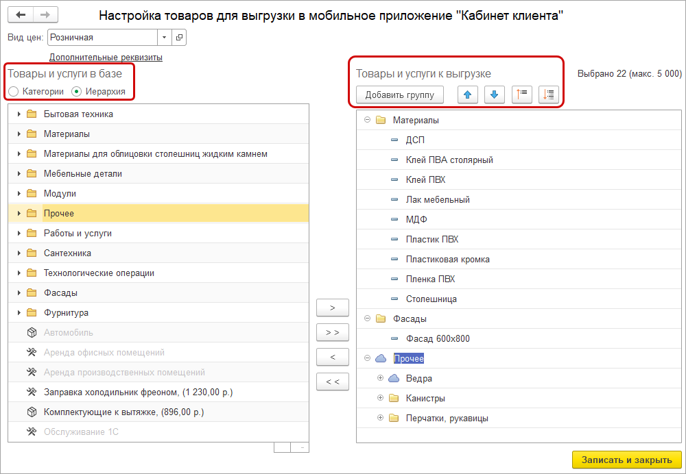 Теперь в правой части формы подбора товаров отображаются группы и товары, которые будут выгружены в мобильное приложение.