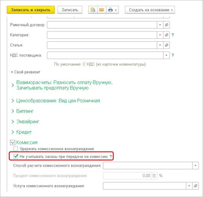 В договор контрагента с видом операции С комиссионеромм в группе Комиссия добавлен признак Не учитывать заказы при передаче на комиссию.