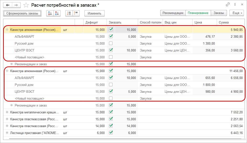 При переключении в режим планирования расчета потребностей для каждой номенклатуры отображается полный список возможных поставщиков, по которым установлены цены. Также доступен выбор нового поставщика. Выбрать его можно при планировании, а информацию о нем заполнить позднее в уже сформированном документе.