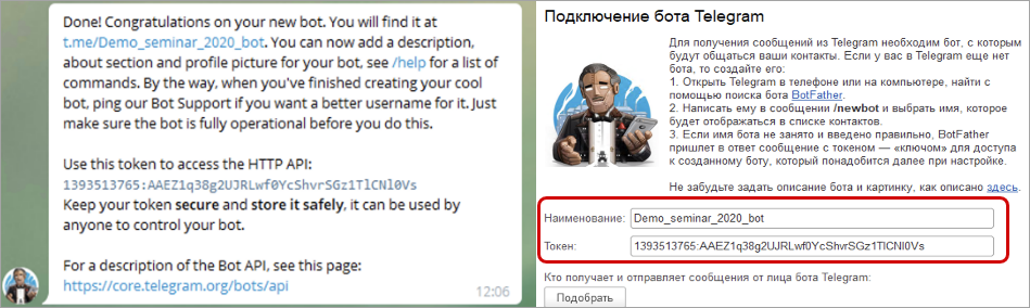 Для настройки интеграции с "Телеграм" необходимо заполнить наименование и токен бота, выданные при регистрации бота в "Телеграм".