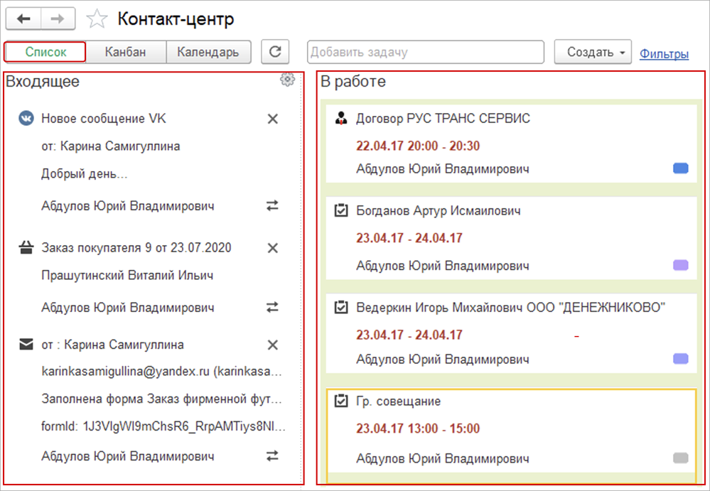 С новой возможностью Контакт-центр сотрудники в едином рабочем месте общаются с клиентами, решают текущие и просроченные задачи, отвечают друг другу, планируют работу в календаре.