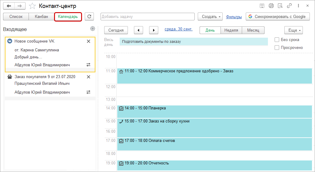 Для просмотра дел в контакт-центре доступно несколько вариантов: список, канбан, календарь.
