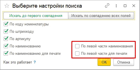 Если дополнительные области не указаны, поиск происходит по полям справочника: наименование, полное наименование и артикул.