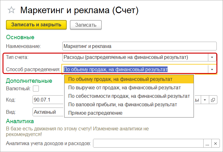 Для этого у косвенных расходов должен быть выбран тип счета "Расходы, распределяемые на финансовый результат" и один из способов распределения.