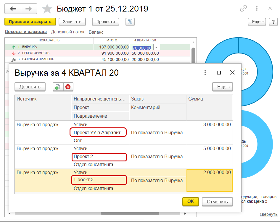 Таким образом, доходы и прямые расходы учитываются в детализации по проектам.