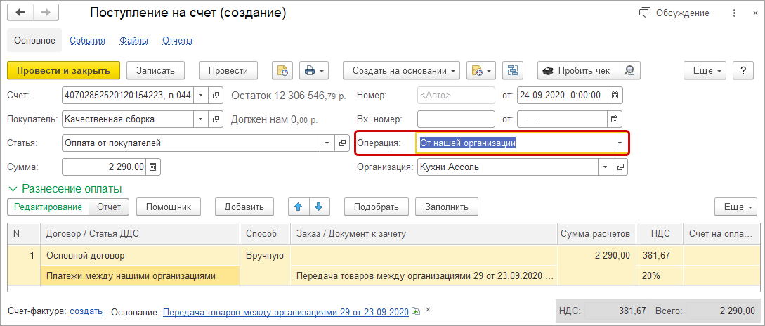 Для оплаты передачи товаров в денежных документах добавлены новые виды операций: "Нашей организации" и "От нашей организации".