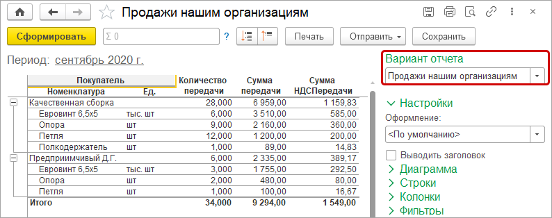 доступны общие продажи, продажи между своими организациями и продажи внешним