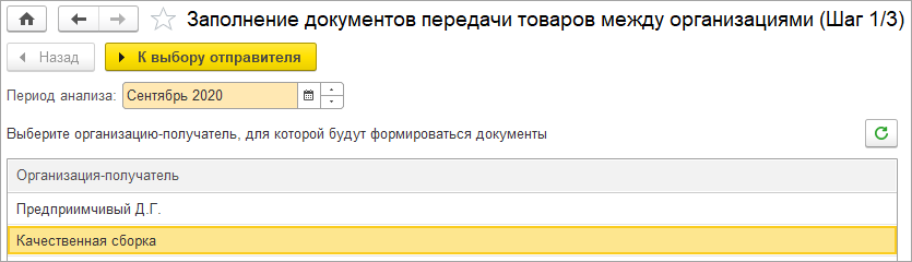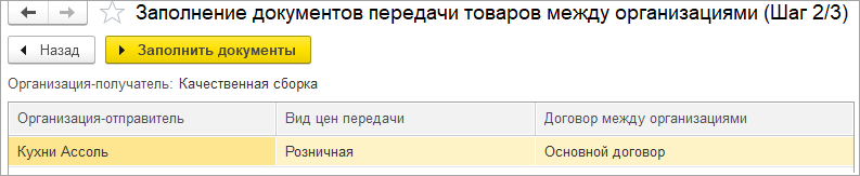 На втором шаге выбираем организацию-отправителя (владельца товаров) и переходим далее по кнопке "Заполнить документы".