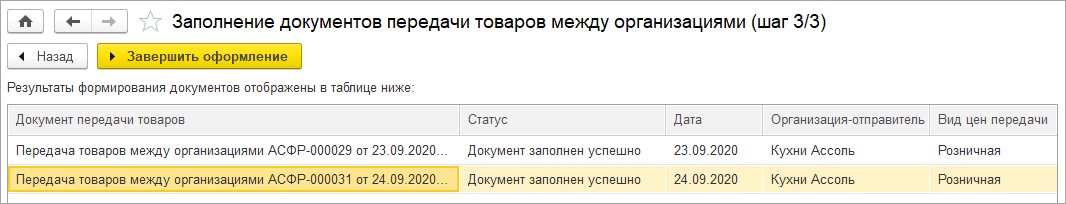 В течение одного дня создаётся лишь один документ передачи, который в будущем будет заполнен всеми товарами организации-владельца, которые продавались организацией-продавцом в этот день.