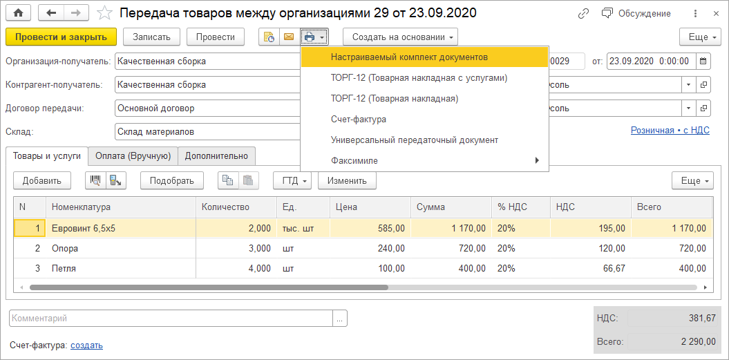 Теперь документы можно открыть и распечатать. Доступны несколько печатных форм и возможность распечатать сразу комплект документов.